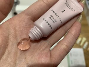 クリアピンクのきれいな色。ジェルなので液だれすることなく、肌になじませやすく、オイル状になったら