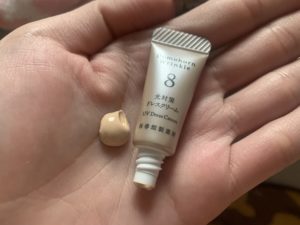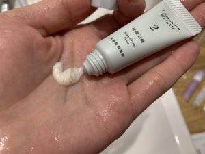 保護乳液は、乳白色のすこしとろみのある肌ざわりで、500円玉大の乳液を手のひらで顔の上にベールを作るように