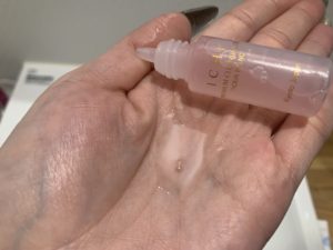 まずは、クレンジング&洗顔、見た目は透明の液体にピンクのオイルが下に二層になっている感じ